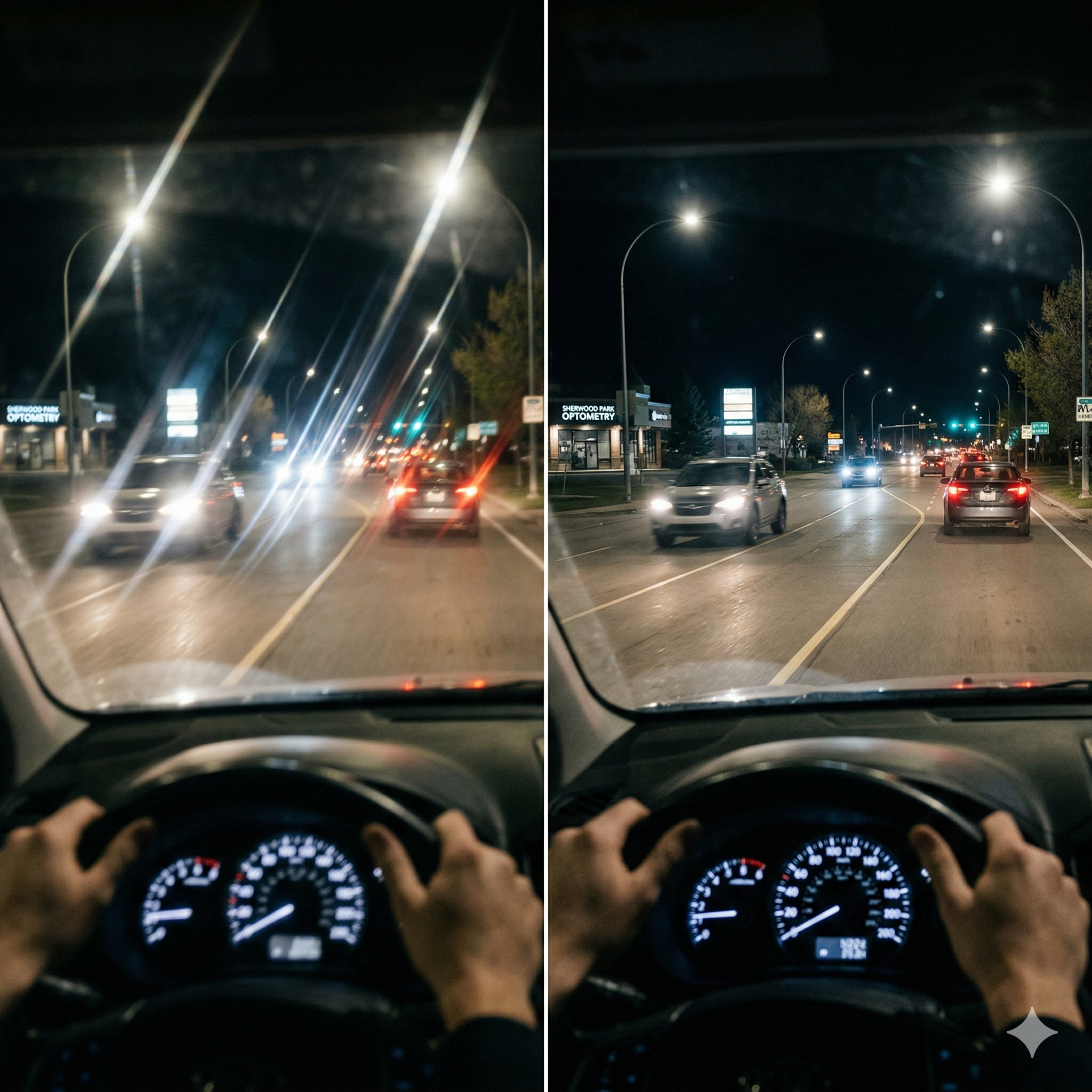 Night Driving Difficulty: Seeing "starbursts" or long streaks around headlights and streetlamps.