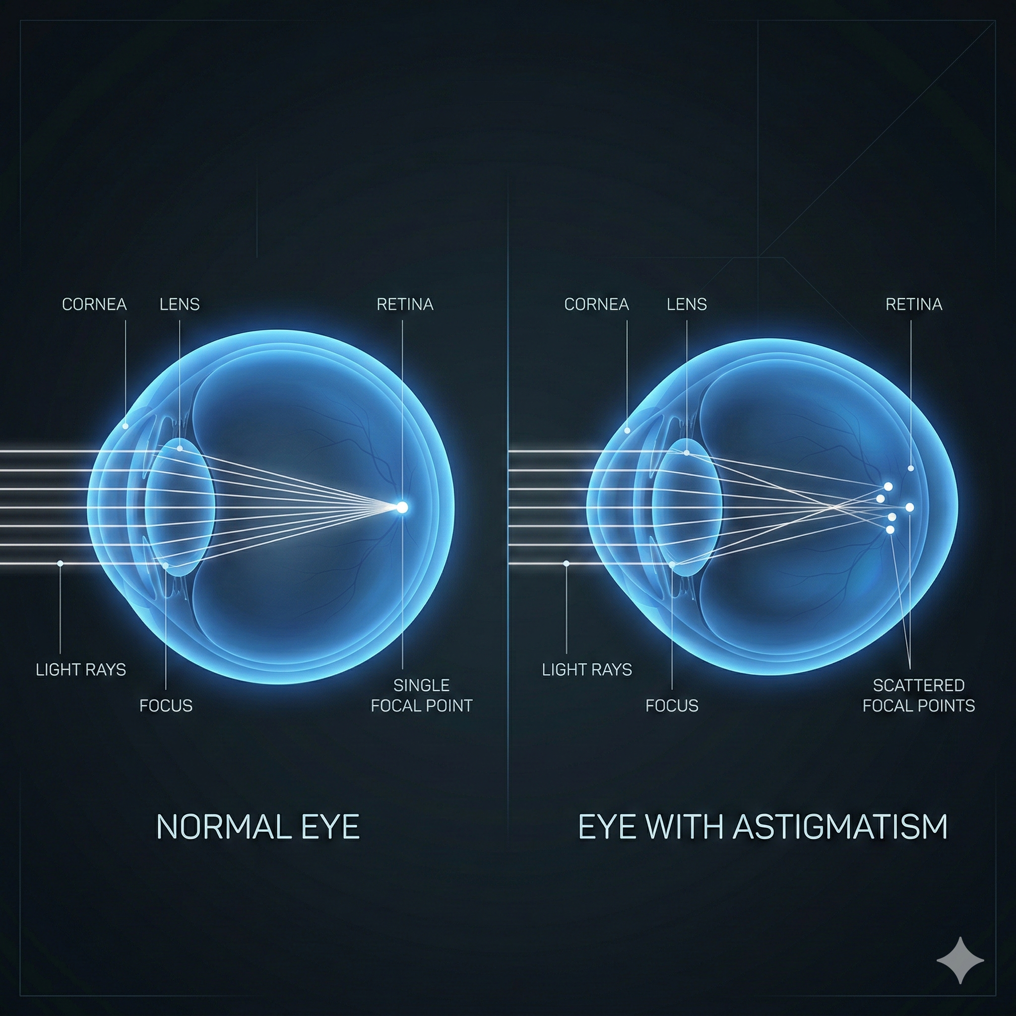This irregular curvature means that light entering your eye doesn’t focus on a single point on the retina. Instead, light is stretched or distorted, making objects at all distances appear blurry, tilted, or "streaky."